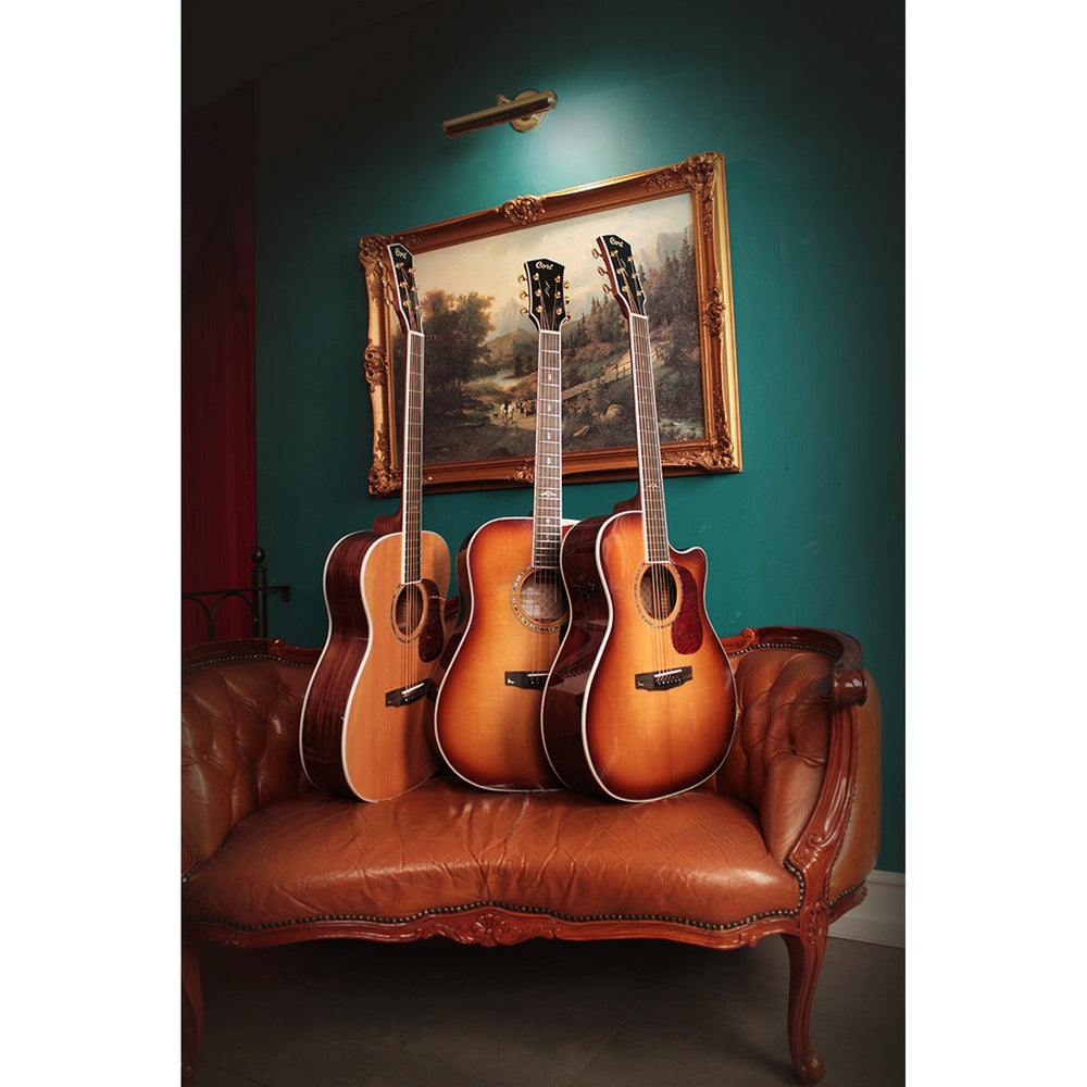 The Cort GOLD D8 Acoustic-Electric Guitar, Dreadnought, Light Burst is designed for players who crave the rich, warm sound of a vintage instrument. This handcrafted masterpiece features a revolutionary Aged-to-Vintage (ATV) solid Sitka spruce top. The ATV process replicates the tonal characteristics of a well-aged guitar, delivering a big, open sound right out of the box.