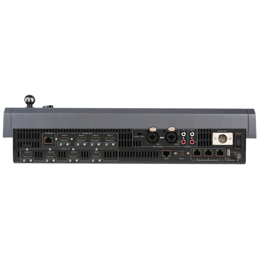 4K switcher with built-in streaming encoder, recorder, camera controller, and audio mixer. 14" touch screen for operating.