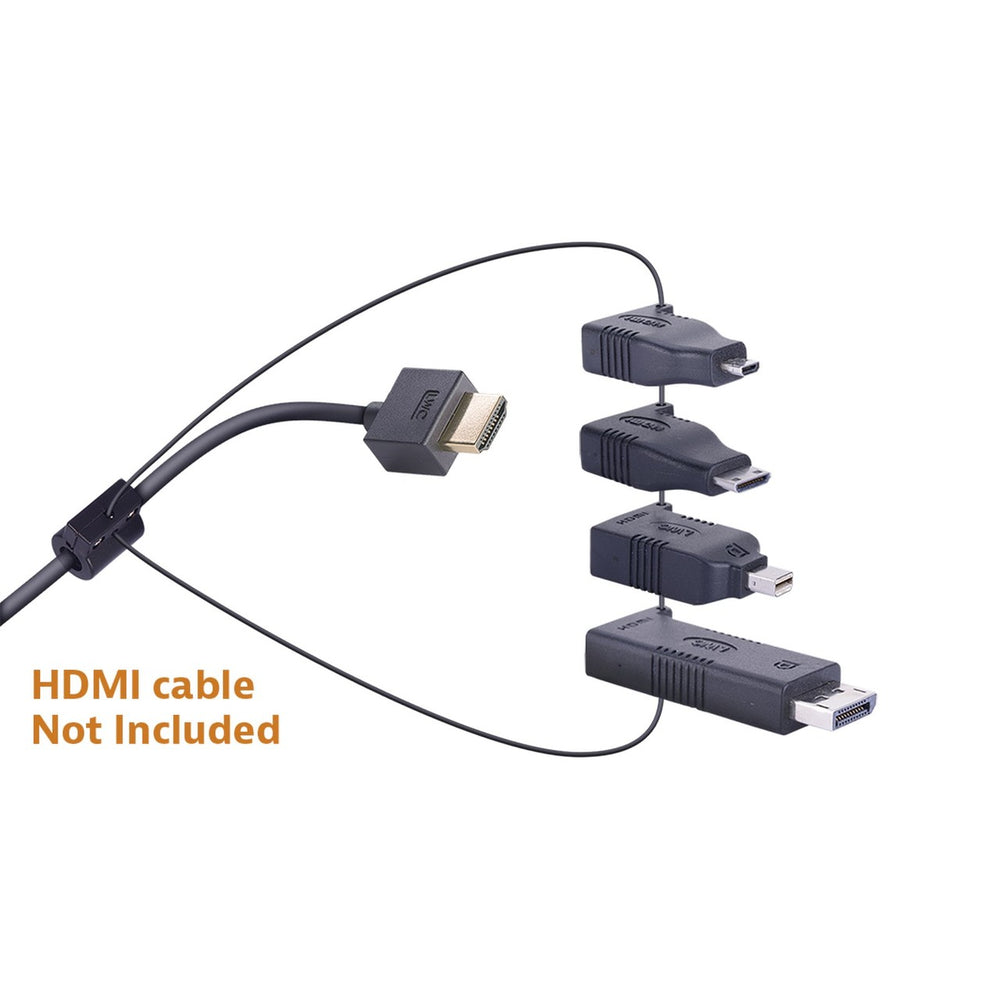 The full DL-AR2 unit includes the following adapters in the basic format: (1) DisplayPort male to HDMI female, (1) Mini-DisplayPort male to HDMI female, (1) Mini-HDMI “C” male to HDMI female, and (1) Micro-HDMI “D” to HDMI female. The adapters are molded with a very strong eyelet that attach to the aircraft-grade steel cable. The main clamp is ABS and it can connect to HDMI cables up to 11mm in diameter. Two sets of foam rubber inserts for differing cable sizes are included.