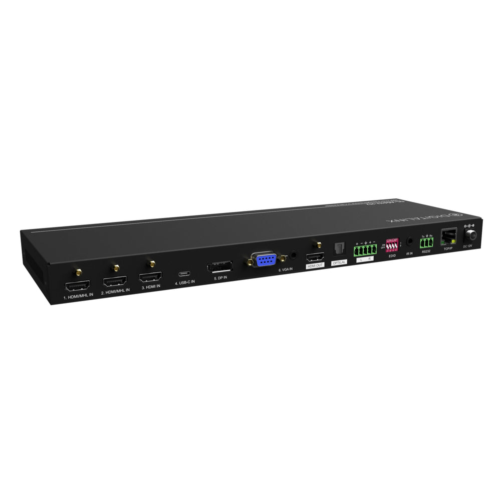 - HDMI 2.0 compliant 6x1 auto switcher with (3) HDMI, (1) USB-C, (1) VGA w/ audio, and (1) display port input and (1) HDMI output