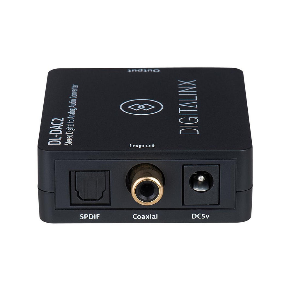 The DigitaLinx DL-DAC2 is a PCM two channel to stereo audio converter. The DL-DAC2 features optical and digital coaxial input audio connections. Analog output is simultaneously available on the 3.5mm jack and the stereo RCA jacks.