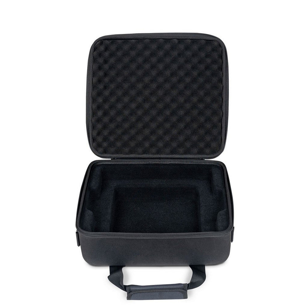 The case uses a lightweight molded EVA exterior shell combined with a water resistant polyester lining to support everyday transport. A custom molded interior compartment fits the contours of the device to keep it securely positioned. Additional internal space allows storage of cables and the power supply underneath the unit.