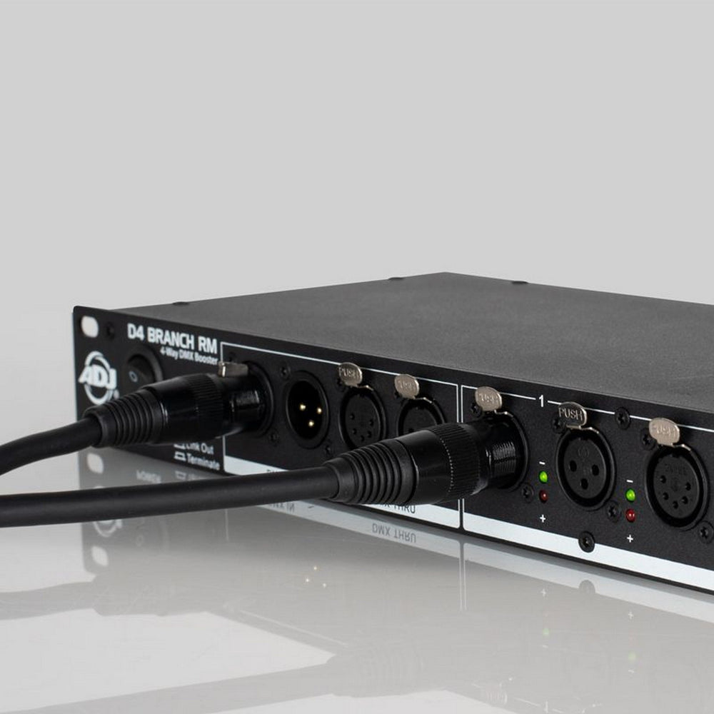 The ADJ D4 Branch RM is a single rack space, 4-way distributor/booster with 3-pin and 5-pin XLR input and output jacks. This unit takes the incoming DMX signal and splits it to four (4) separate outputs that are electronically isolated from each other to ensure uninterrupted data. In addition, each output has dedicated drivers to boost the incoming signal, and the unit includes a link / terminate button for easy troubleshooting.