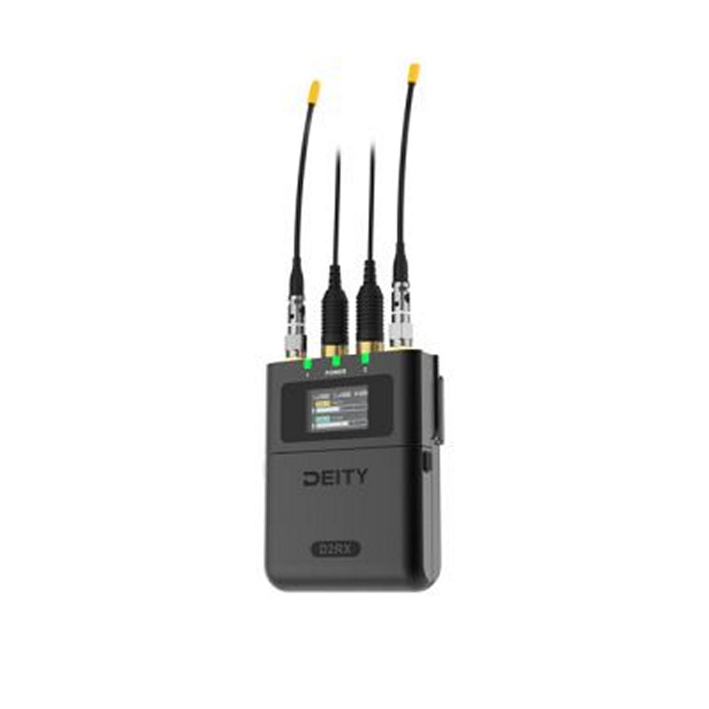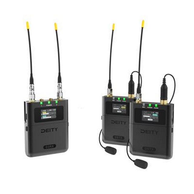 The DEITY THEOS is a professional dual-channel digital UHF wireless system designed for filmmakers, ENG crews, and content creators who need reliable RF performance in congested environments. The kit pairs two DBTX bodypack transmitters with a D2RX dual camera-mount receiver and includes miniature lavalier microphones for on-talent capture.