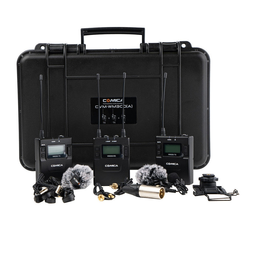 The CVM-WM300A is a dual-transmitter and receiver wireless microphone kit from Comica. This kit runs on built-in rechargeable lithium-ion batteries and has a maximum range of 120m.