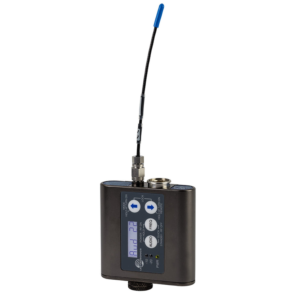 The input section features the unique servo bias input circuitry with a standard TA5M type jack for use with electret lavaliere mics, dynamic mics, or line level signals. A DSP-controlled analog audio limiter is employed before the A-D converter. The limiter has a range of more than 30 dB for excellent overload protection and a dual release envelope that makes the limiter acoustically transparent while maintaining low distortion. The limiter recovers quickly from brief transients, with no audible side effects, and also recovers slowly from sustained high levels to keep audio distortion low while preserving short term dynamics.