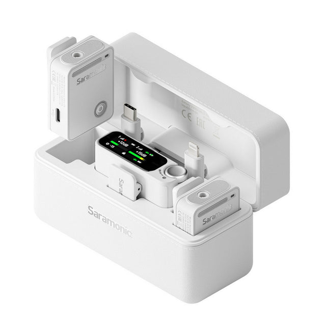 The Saramonic Ultra Dual Wireless Mic System in white delivers broadcast‑level audio with 32‑bit float onboard recording, timecode synchronization, and universal compatibility across multiple devices. It is ideal for filmmakers, content creators, interviewers, and live streamers who demand flexibility and professional audio in a cohesive package.