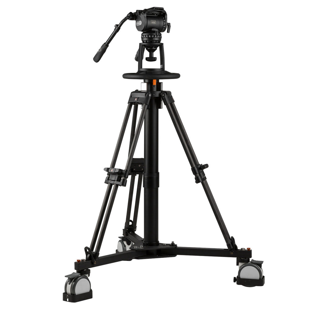 The EP880SK Pneumatic Pedestal Kit is designed and built for location broadcast and studio camera operators who want real quality at an affordable price. The system delivers field-tested reliability, solid construction and all the features required for professional performance. The EP880SK ‘s features include the E-Image Mono-Lock leg design and the Easy Lock base plate system delivering fast, reliable performance that rises above competitors in its price range and class. This kit supports a payload weighing up to 55 pounds. Its EP880S Pneumatic Pedestal provides adjustable resistance to make counterbalancing a breeze. The dolly base has Track Lock wheels to maintain direction during complex dollying and tracking shots. The included GH25 Fluid head boasts a 100mm bowl mount, a 15 position adjustable counterbalance system, and 8 positions of pan and tilt dampening. A large 60mm mounting plate provides an adequate footing for larger studio and cinema style cameras. Double handlebars allow you to maintain firm control on your rig whether transitioning to or setting your shots.