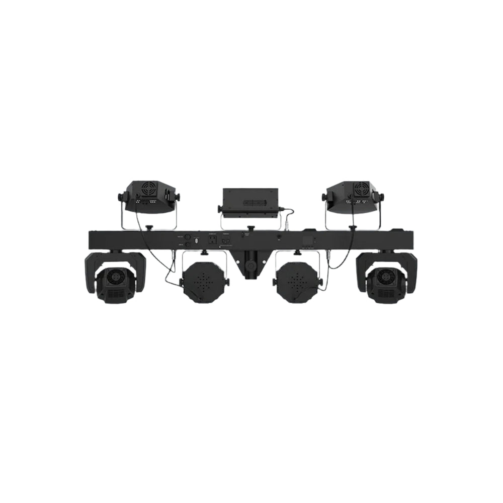 - 5-in-1 lighting system that includes moving heads, derbies, washes, a laser and strobe effect pre-mounted on a single bar
