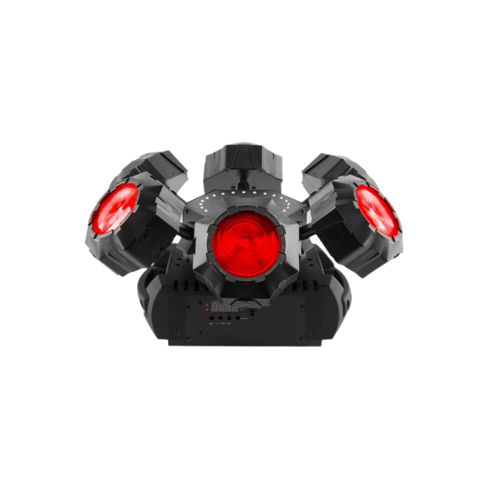 - A multi-effect light that includes adjustable RGBW beams, a round SMD strobe, and a red/green pattern laser on a rotating base