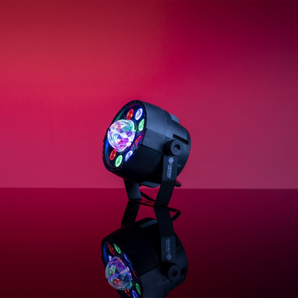 Transform any space into a party zone with the ColorKey Party Light FX Quad-Color LED Wash Lights 3-Pack Bundle! This compact LED wash light packs a punch. It features a motorized RGB party bulb that creates a mesmerizing light show, washing your walls in vibrant colors and sending swirling beams of light across the room.
