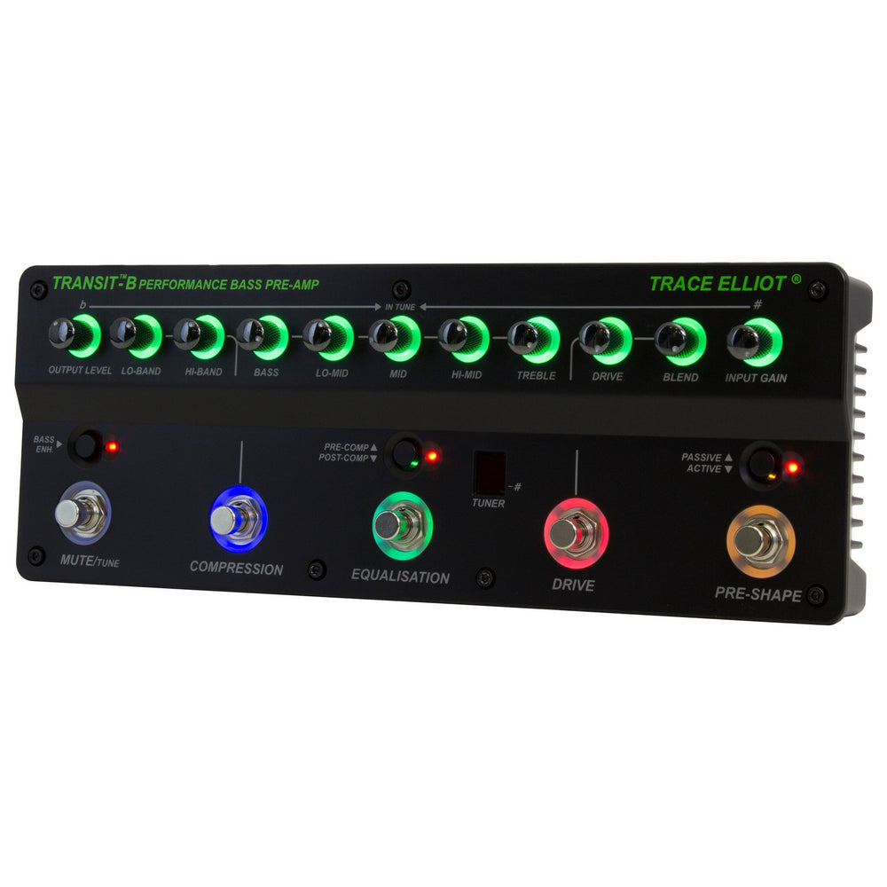 The Trace Elliot Transit B pedal is a professional grade preamp for the discerning bassist. Built-in tools for tone shaping like Pre-shape, 5 band EQ and dual band Compressor are easy to use and easy to tweak on the fly. Features like Drive with blend control and built-in bass enhancement add to the tonal options available. The back-lit control panel becomes the chromatic tuner for accurate tuning. Built-in Pre and Post XLR balanced output, dry output and headphone output give the user the ins and outs they need.