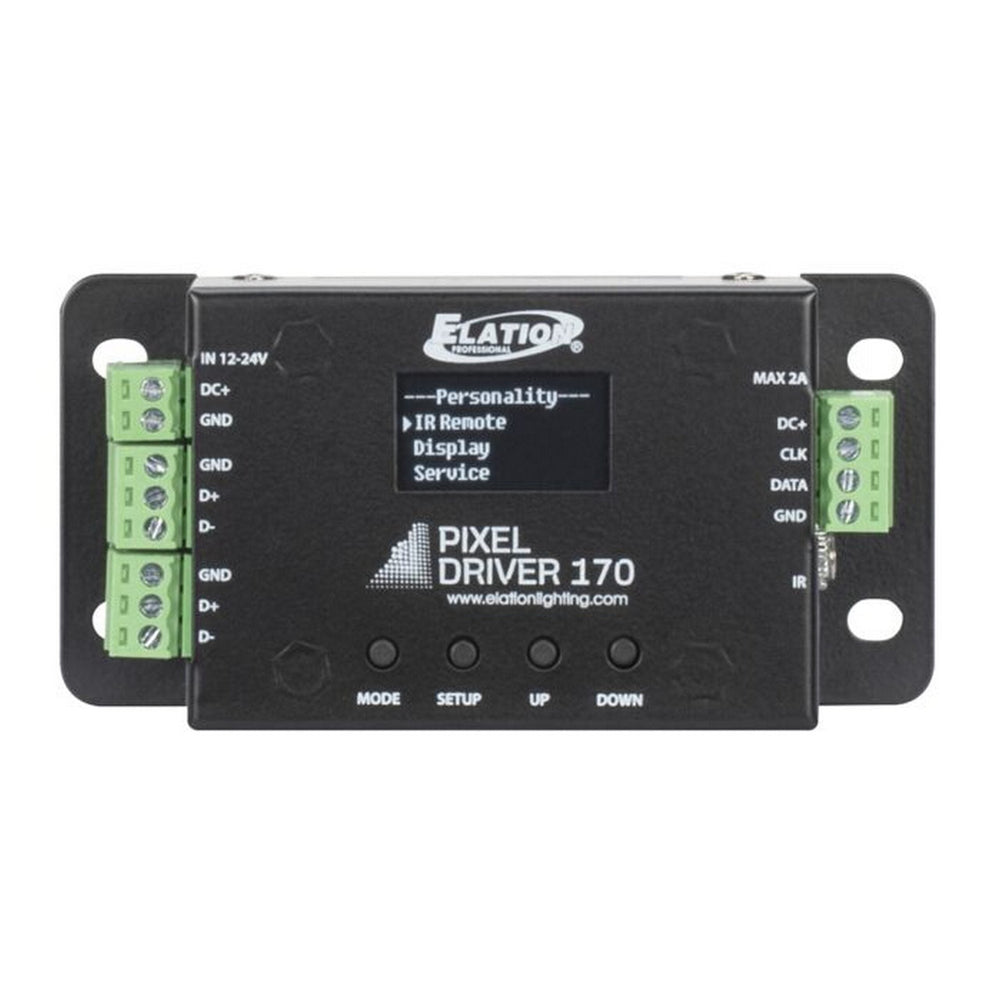 Pixel Driver 170 is a professional tape driver specificallydesigned for the Elation Pixel Tape 16IP and Pixel Tape 40IP. This driverprovides simple and easy control options including a 3-button OLED Display, ELIR Remote (included), and one full universe of DMX control (170 pixels). ThePixel Driver 170 features an easy-to-use OLED display, Pixel grouping, separate3pin terminal blocks for DMX IN and OUT, a 4pin terminal block for LED tape output,and a 2pin terminal block for 12-24VDC power IN. The unit also includes onePIX-AD3 adapter to connect between LED tape out and Pixel Tape 16IP & PixelTape 40IP.