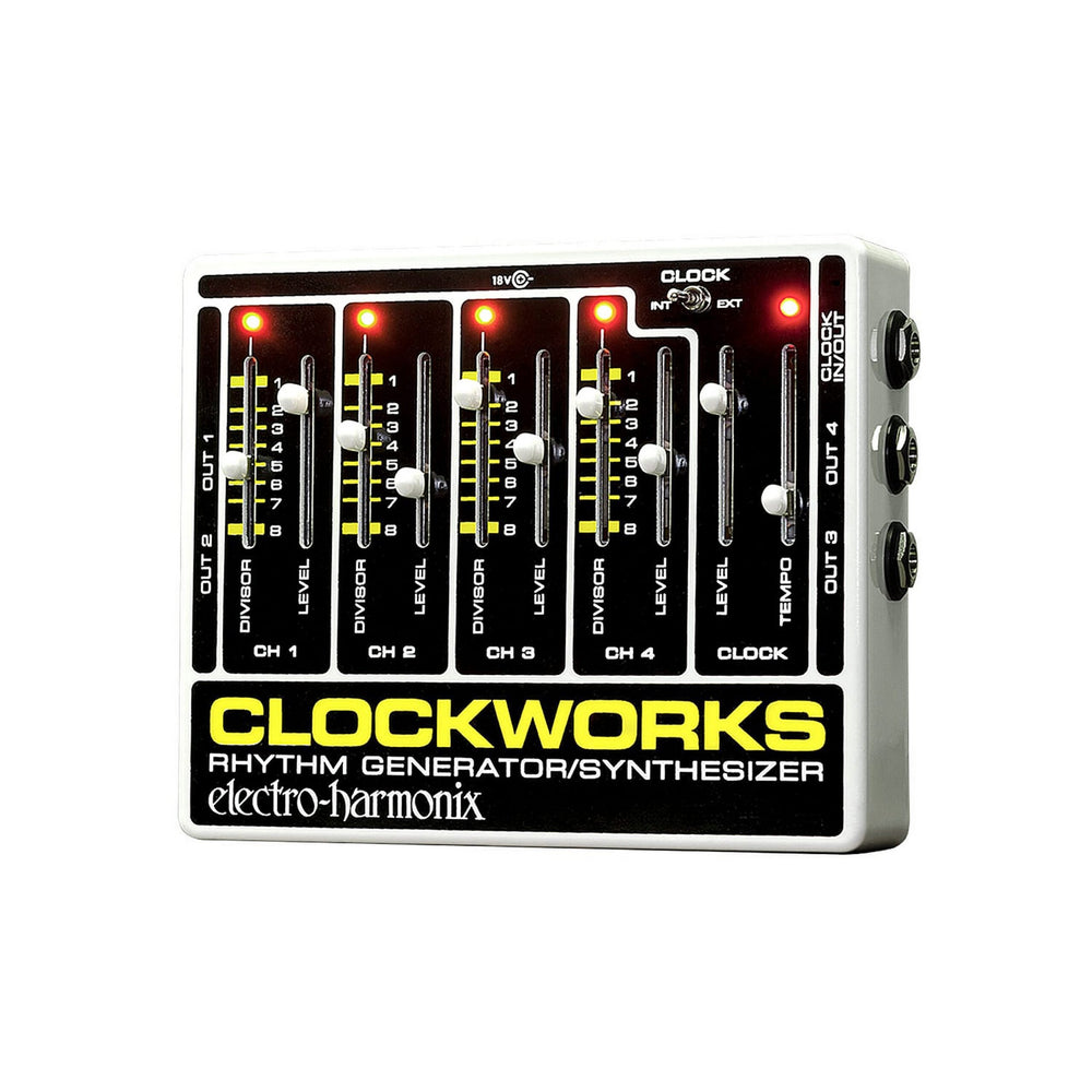 The EHX Clockworks Rhythm Generator/Synthesizer is a faithful reissue of the classic pedal made by Electro-Harmonix in the 1970s. It can be used as a master clock for sequencers and drum machines, and to trigger electronic percussion products like the EHX Crash Pad classic drum synth. Clockworks doesnt create sound on its own. It generates pulses to trigger other devices and can set the tempo for a drum machine or sequencer like EHXs 8 Step Program.