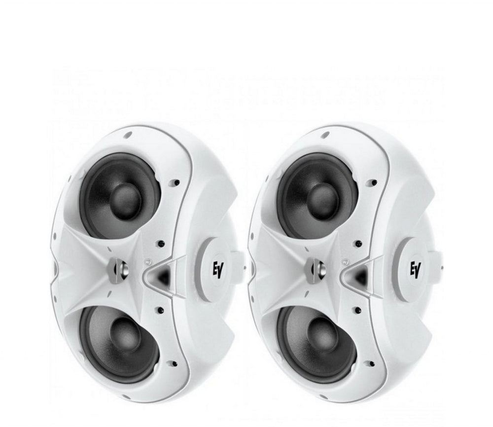 The Electro-Voice EVID4.2T Dual 4- Inch Two-Way Surface-Mount Loudspeaker and 1-Inch Titanium Tweeter and 70V/100V Transformer | White - Pair is a very compact full range loudspeaker ideal for indoor and outdoor applications requiring high-quality sound. It’s shape and size make it nearly invisible for use in background/foreground music systems for restaurants, bars, patios, retail, and other applications The 4.2T’s three-dimensional elliptic baffle symmetrically locates the 1” Ti high frequency element with a Coherent Coverage Waveguide in front of, and between the 4” low frequency drivers. This careful shaping, location, and 10° splaying of the lf units provides coverage control by the resulting line array. EVID’s mounting system provides greater range of aiming angles in both horizontal and vertical planes than other types. The curved grille features designed-in weather resistance and a hidden leash for safety. The unit also equipped with a transformer for 70V and 100V use.