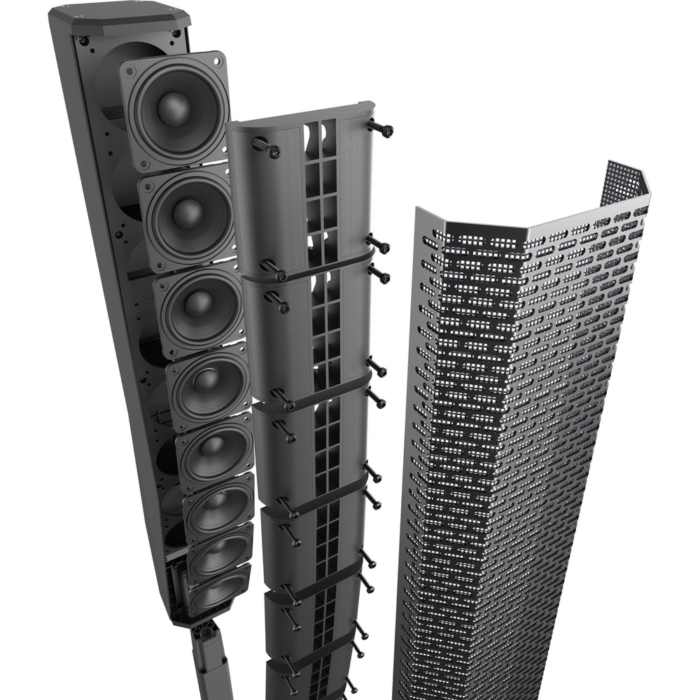 The full-range column array and its eight lightweight 3.5” neodymium drivers provide ultra-wide, full-bandwidth 120 coverage via proprietary waveguides; array-formed 40 asymmetrical vertical coverage ensures acoustic output is directed towards both sitting and standing audience members.