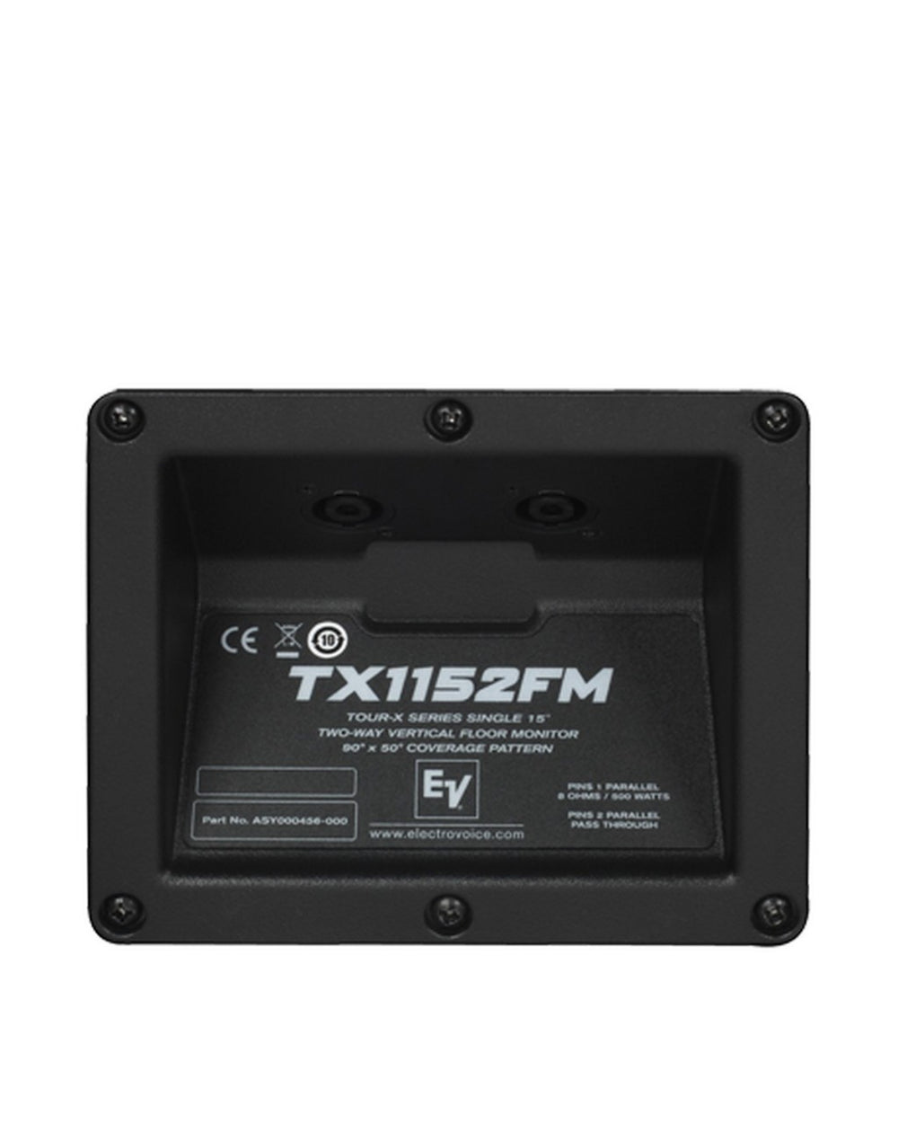 The Electro-Voice TX1152FM 12-Inch Two-Way Full-Range Floor Monitor is a compact, high output dedicated floor monitor for use on small to medium-sized stages where high quality vocal and instrument applications are required in a lightweight package.The TX1152FM enclosure utilizes Signal Synchronized Transducers™ (patent pending), a design that aligns the woofer and compression driver by locating them on separate baffles, and integrates a low distortion port between the baffles. This offers tremendous advantages over traditional flat baffle construction: the acoustic centers of the woofer and compression driver are closer together, synchronizing arrival time; the voice coils of the compression driver and woofer are in the same plane, achieving linear phase response; and the size of both baffles are smaller than a single baffle; resulting in a smaller footprint. The TX1152FM utilizes the DH3, a high output 1.25” titanium compression driver, coupled to a Constant Directivity™ 90° x 50° horn. The SMX2151 15” woofer has an FEA optimized magnet structure and shorting ring for ultra low distortion. The crossover uses steep 24 dB/octave slopes with equalization for very smooth response in vocal range, and has a built in protection circuit for long term reliability. The combination of the transducers, enclosure, and crossover result in a compact floor monitor that is capable of very high output levels levels before feedback. The TX1152FM has a variety of features that make It'suited as a dedicated floor monitor. The internally braced enclosure is constructed out of a combination of plywood and MDF, and coated with EVCoatfor maximum strength and durability. The unique grille design is very strong and dent resistant, and features a rotatable logo. Four way handles allow for gripping the TX1152FM in a variety of positions. The recessed input panel with dual NL4 connectors is located on the rear of the enclosure, which keeps the connectors hidden and away from the performers on stage.
