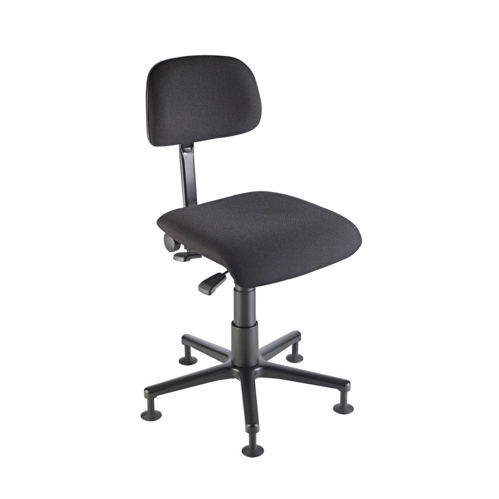 Fully adjustable percussion chair with upholstered seat and backrest. Cushioning and fabric (Trevira CS) are made from inherently fire-resistant materials. The black fabric has a durability rating of 100,000 abrasion resistance cycles. The black powder-coated 5 leg base provides perfect stability. The pneumatic seat height adjustment is variable using a release lever. The height of the backrest and the seat angle are also adjustable. Typical for a percussion chair, the seat is rotatable. Quiet and slip-resistant feet are also a part of the delivery.