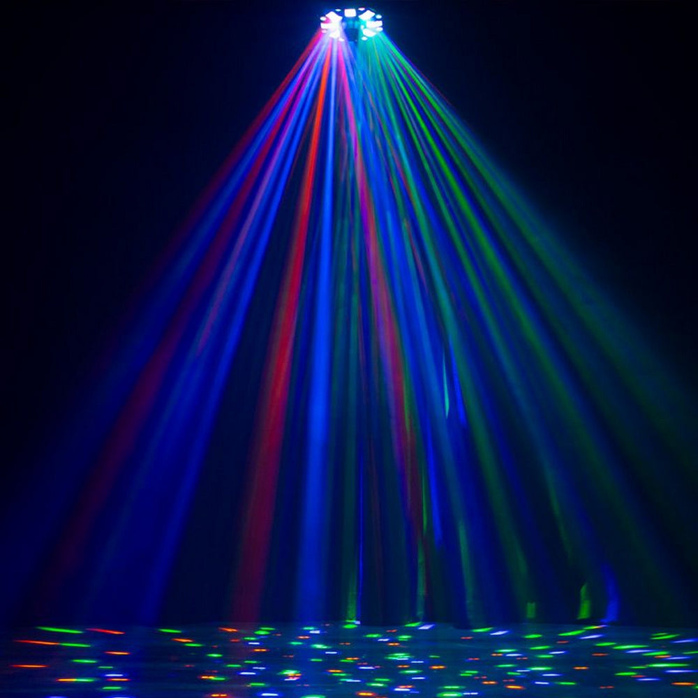At the heart of the Moonflower effect are six 5W RGBWA (Red, Green, Blue, White, Amber) LEDs that project multi-colored, quick-moving beams, filling the room with dynamic patterns. Complementing this, the Wash effect utilizes eight 3W UV LEDs to bathe the dance floor in a rich ultraviolet glow, adding depth and dimension to the lighting display. The integrated red and green laser diodes produce razor-sharp beams that can be projected onto any surface, further enhancing the visual experience.