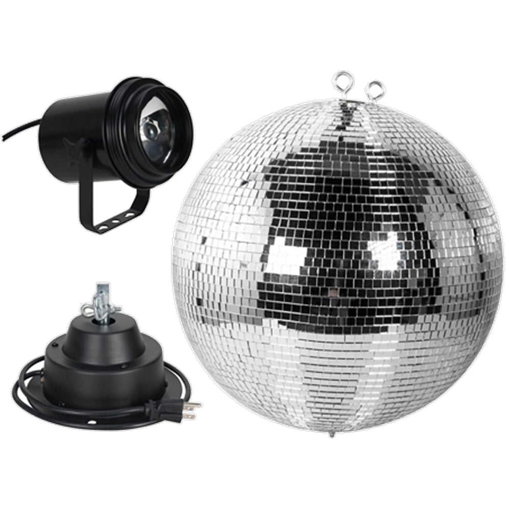 The M600EL mirror ball package from Eliminator Lighting is an all-in-one mirror ball kit with a 16-inch mirror ball, mirror ball motor and a pinspot lighting fixture.