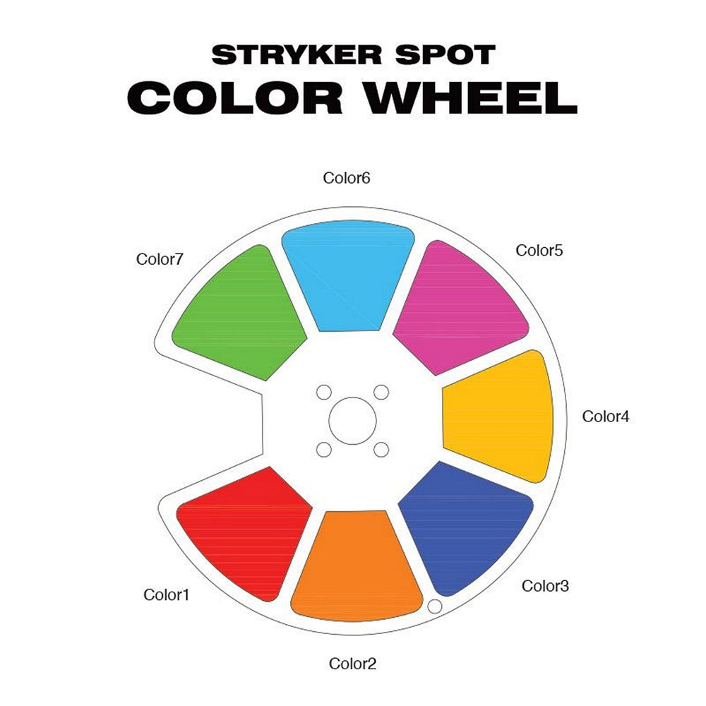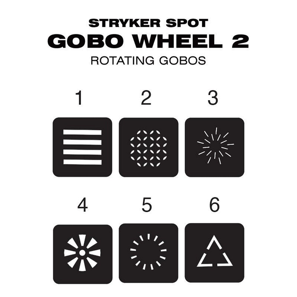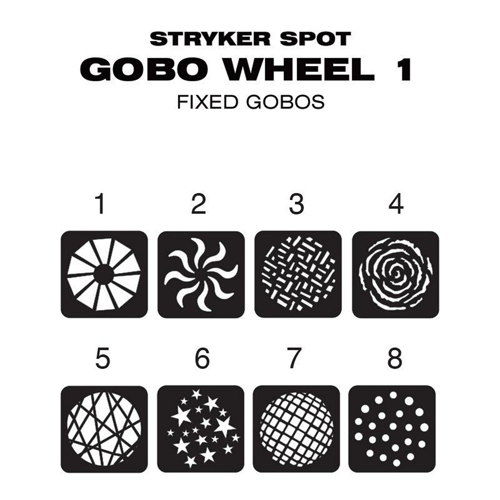 The Stryker Spot comes with an extensive collection of features, including 8 fixed static and 6 replaceable rotating GOBOs, on independent wheels. It also features a separate 7-slot color wheel and two rotating prisms (5-facet linear and 6-facet circular). The fixture's motorized zoom provides a variable beam angle of 9° - 14°, while motorized focus allows sharp pattern projections over varying distances.