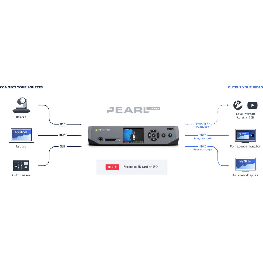 The Epiphan Pearl Nano Streamer and Recorder is a versatile and portable device that combines ingestion, encoding, HDMI pass-through, and recording capabilities. It can be used for video distribution, contribution encoding, streaming, and recording in various production setups.