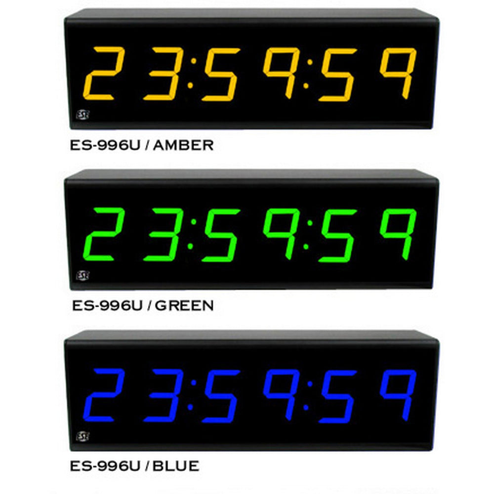 The ES-996U is a Time Code display featuring 2.3" high red LED displays. The unit is housed in a black-textured aluminum wall-mount enclosure (5" H x 15" W x 3.5" D). The unit accepts, via the rear-mounted terminal block (BNC connector on rack-panel units), either ESE Time Code (TC76, TC89, or TC90) or SMPTE/EBU Time Code. RS-232C ASCII Time Code (format "0", "1" or "A" at 9600 baud) may be input via the rear-mounted 9-pin connector. The ES-996U will automatically determine which code is being received. A rear-mounted DIP switch is used to configure the display for 12 or 24 Hour format, or to display the Date instead of time-of-day (if incoming time code contains Date information, such as ESE TC90, date-encoded SMPTE/EBU or ASCII formats "1" or "A"). If the Time Zone option is ordered, a rear-accessible DIP switch is installed for this function. If receiving ESE Time Code from a timer, the unit will display Minutes, Seconds and Tenths of Seconds (if the timer has the Tenths option).