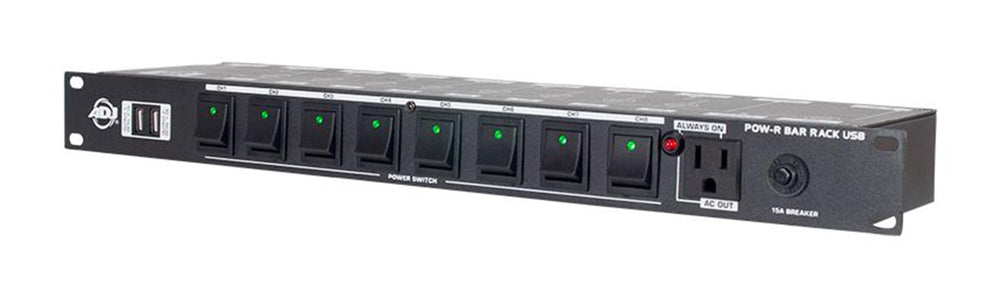 The ADJ POW-R RACK USB is a quality AC Power Center that fits in a 19-inch rack to help eliminate the clutter and mess of wires and unneeded extension cords. It features 8 lit rocker switches plus 2 always hot outlets, 2 USB charging ports and a circuit breaker reset on the front panel, and 8+1 3-prong 120V Edison plugs on the rear panel.