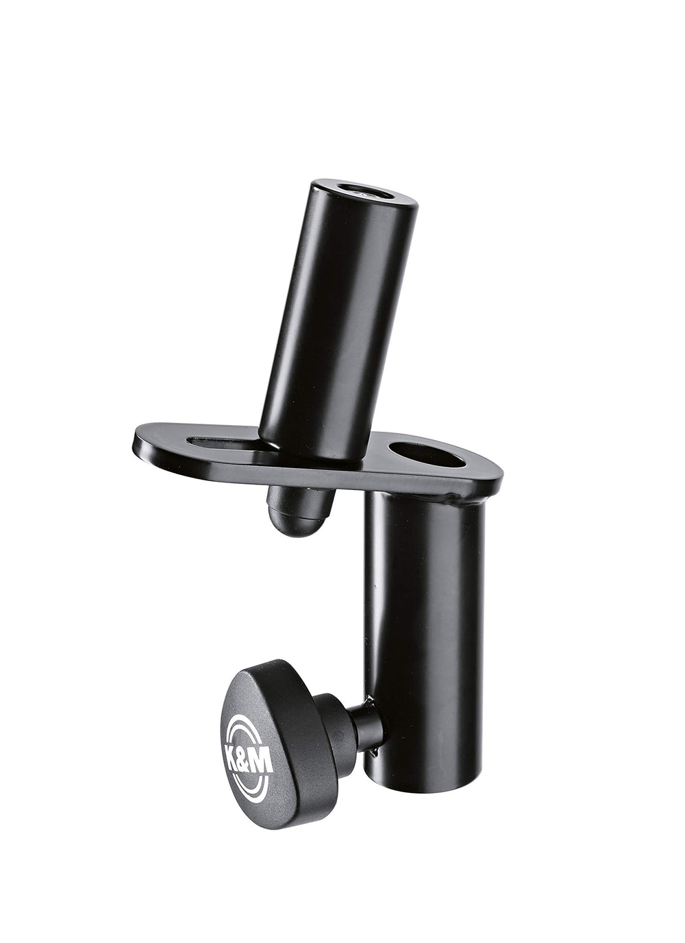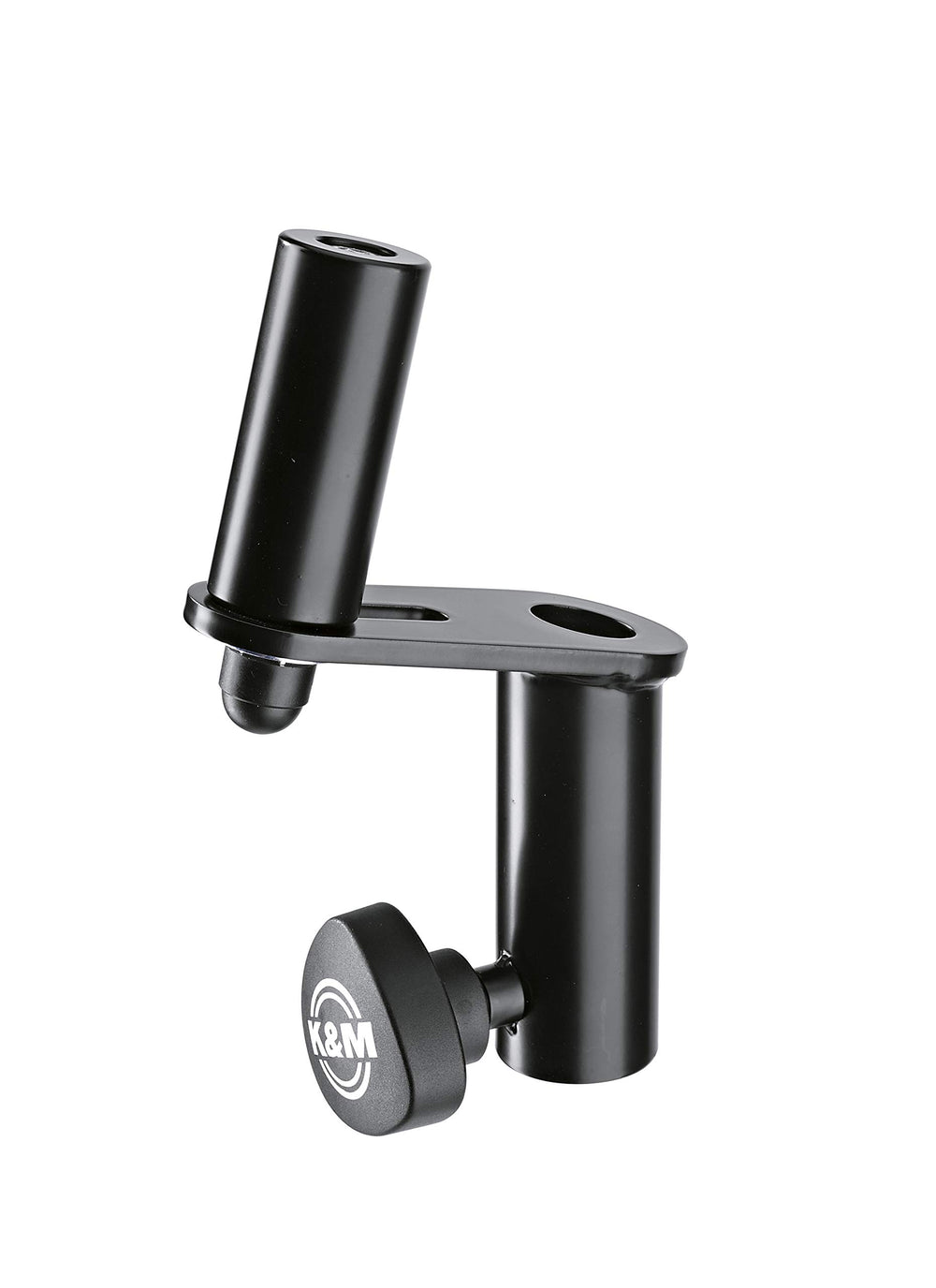 Speaker tilt connector with 15 inclination attachable to speaker stands and distance rods with a tube diameter of 1.378". The depth of the tube intake is approx. 3.937". Due to the off-centre positioning in connection with the 15 inclination, the center of gravity of the speaker cabinet moves back to the centre and consequently provides more stability and steadiness for the stand or distance rod. The depth can be adjusted up to 1.969". The speaker mounting bolt has a diameter of 1.378" and a height of 3.307". Solid steel construction with robust powder coating. Convenient clamping screw for mounting on the speaker stand.