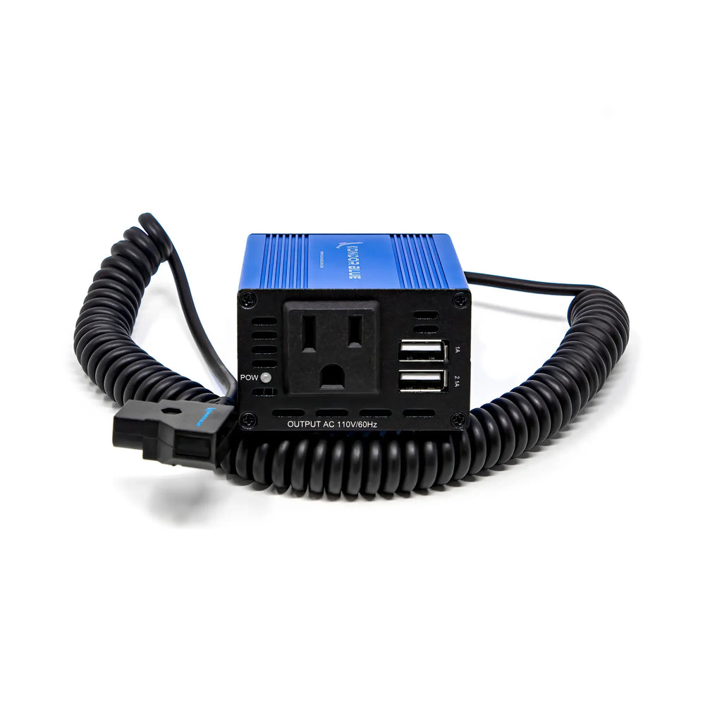 THE KONDOR BLUE “SPARK-150” is a D TAP to AC Power Supply Inverter that allows for Mobile Power via a standard Wall Plug Outlet. Made for powering Quasar T8 T12 X Crossfade LED Lights House Bulbs and More! (P-TAP V Mount Gold Battery). LED Tubes are so popular, lightweight and easy to rig but powering them can become a challenge thus defeating their portability and ease of use, especially when on location. This SPARK-150 solves the issue. This is also a great way to power a DIT station or other on set electronics such as portable fans, field monitors, motorized sliders, etc. This tool could become a Mobile Charging Station for smaller batteries as well whether it be for LPE6 or DSLR batteries The possibilities are limitless!