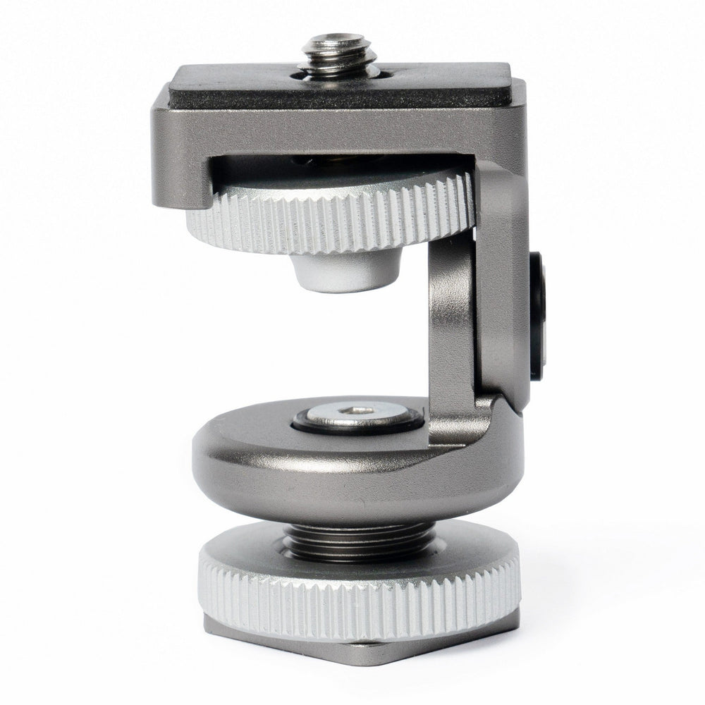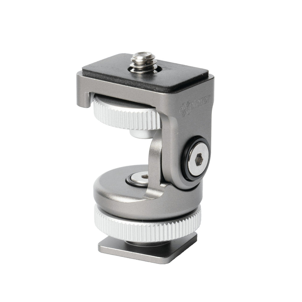 The Explorer AX-02 Aura Explorer Mini Tilt-Head is a shoe mount designed to be used with hot or cold shoes allowing accessories such as LED light panels, microphones, and more to be mounted to a camera, video setup, quick release plate, or a small tabletop tripod. The Explorer AX-02 Aura Explorer Mini Tilt-Head has a max load capacity of 2kg (4.4lbs) and includes a 1/4 bottom mount crew thread in addition to the shoe mount. The AX-02 allows the mounted accessory to tilt up and down with friction adjustments made according to weight load with the included hex key wrench. The Explorer Mini Tilt-Head is very lightweight at only 36g and is made with a high-quality aluminum alloy construction with an anodized finish for durability. To attach to a camera, slide the foot into the hot shoe and tighten the silver lock. Use the top silver lock to mount the accessory and check the tilt dampening suits the accessory's weight. Use the included hex key wrench to adjust damping according to load weight.