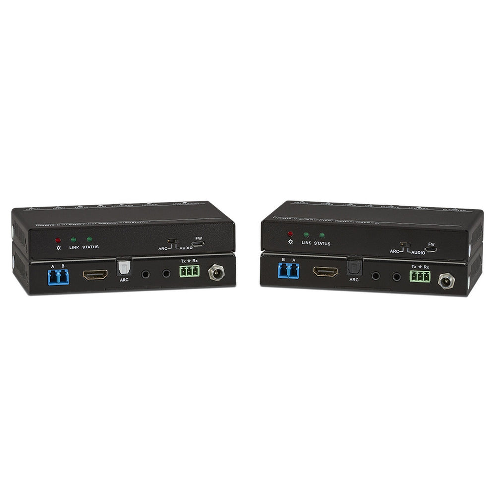 The KanexPro EXT-4KFIBERPRO is an HDMI 2.0 extender set engineered to extend 4Kx2K@60Hz with 4:4:4 Chroma Sampling rate and HDR up to 984ft. (300m) with zero latency. Compliant with HDCP 2.2, the set includes one transmitter and one receiver via two- single mode optical fiber ports or two OM3/OM4 multi-mode fiber cables. Front panel Dip switch allows SPDIF ports on both the sender and receiver to function as ARC (Audio Return Channel) mode or normal audio support for downstream devices. This extender can also be controlled over fiber via bi-directional IR and RS-323C.