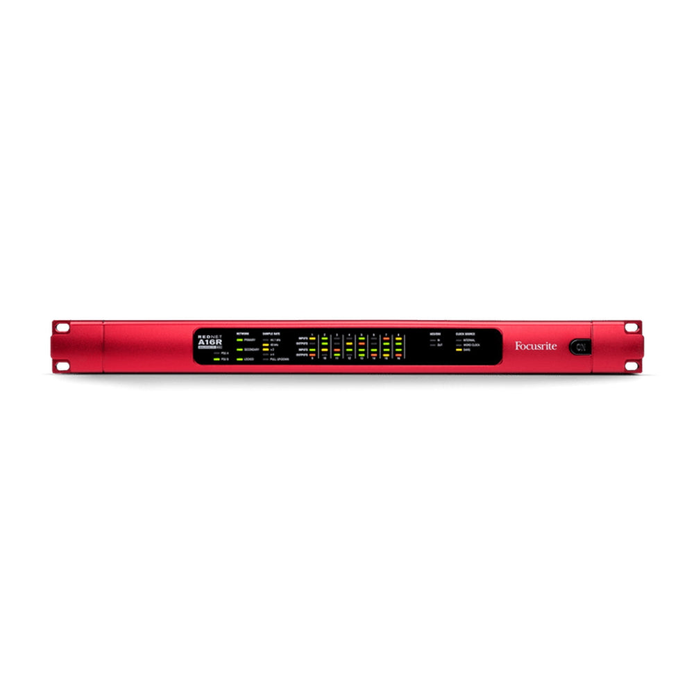The Focusrite RedNet A16R MkII is a high-performance 1U rackmount interface offering 16 channels of analog line-level I/O with precision level control, seamlessly integrated into Dante audio-over-IP networks. Engineered for reliability and flexibility, it features redundant power and network connections, remote control via RedNet Control software, and exceptional audio quality up to 24-bit/192 kHz.