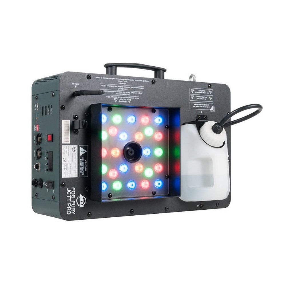 The ADJ Fog Fury Jett Pro is a high velocity vertical Fog Machine that mixes color into the fog from 28x 3-Watt LEDs (6 Red, 7 Green, 6 Blue, 3 Amber & 6 UV LEDs). The Fog Fury Jett Pro produces a dry even blast of fog over 40 feet (12 meters) in the air. It has a special heating element design that uses an oil type transmission throughout the pipeline to prevent clogging. It is also equipped with a high performance Italian pump system for optimum output. ADJās Electronic Thermo Sensing (ETS) technology is on-board to maintain optimum heat levels with short warm-up time between fog blasts.