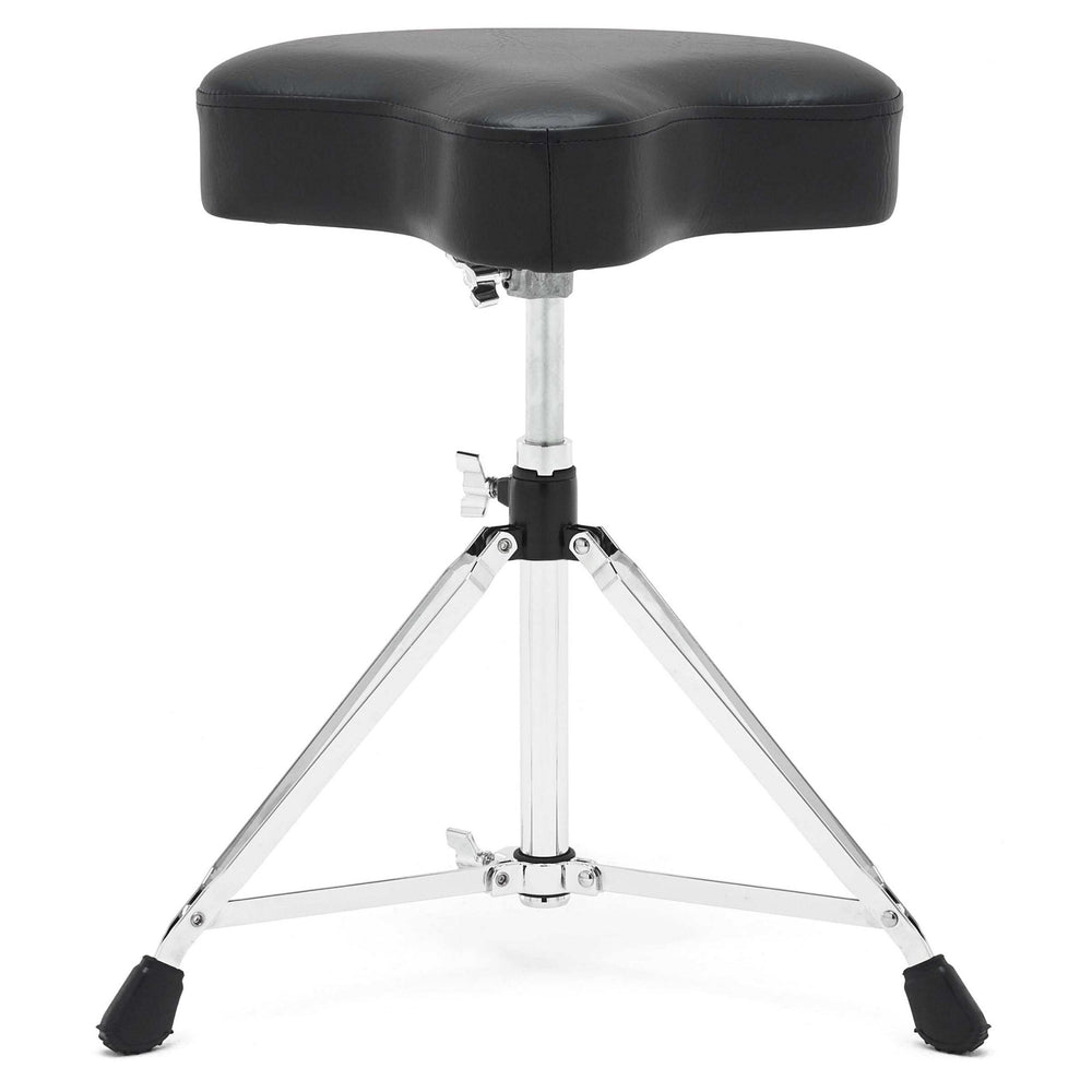 One of Gibraltar's bestselling thrones. It's double-braced for extra stability, yet lightweight for easy transport. The durable motorcycle-style top has thigh cutouts, allowing maximum mobility and comfort. Set and secure to your desired height with the built-in memory lock. · Motorcycle style vinyl top Top grade foam for maximum comfort · Cast height adjust collar with nylon bushing · Knurled adjustable height support stem with memory lock · Double braced collapsible tripod base · Top dimensions: 15-1/2 inch.W x 13-1/4 inch.D x 3-1/4 inch.H Height range: 18 inch. to 24 inch.