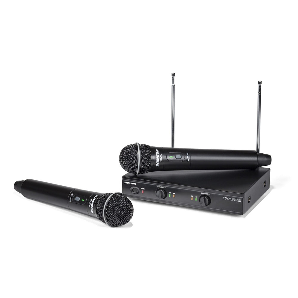 Samson's Stage 200 is a dual-channel wireless microphone system that provides two handheld dynamic microphones that transmit to a single rugged metal receiver. Each handheld features Samson's Q6 mic element, providing crisp, clear sound and reliable VHF wireless performance for home karaoke, live presentation, education, house of worship and other dual-performer applications.