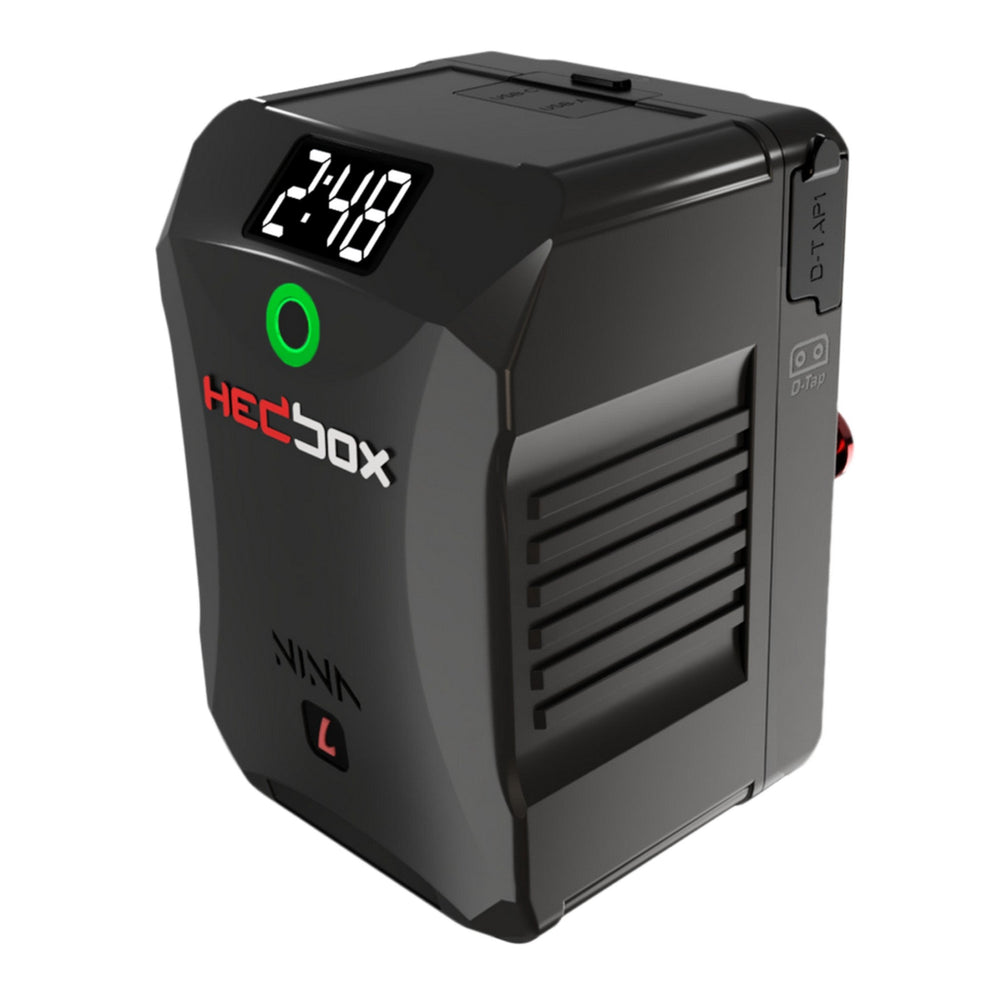 The HEDBOX NINA-Lg Smart Mini G-Mount 150 Wh Battery is a compact and powerful Smart Battery Pack designed for professional videographers and photographers. This portable unit boasts a 150Wh lithium-ion battery with a groundbreaking LCA Low Capacity Alarm (patent pending). This innovative feature alerts users with a distinctive red ring flashing when the battery dips below 20% capacity, ensuring you never run out of power unexpectedly.