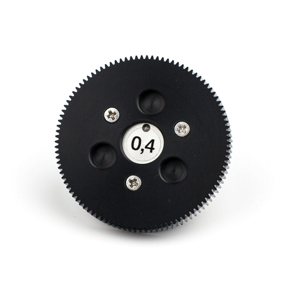 Snap on gear, with dual pin lock mechanism, for the Hedén M26VE motor. Used for lenses and applications with 0.4 module.