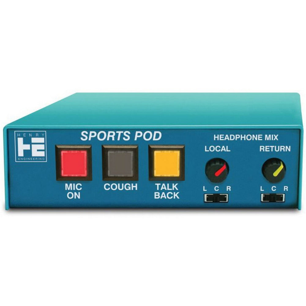 The Sports Pod is an announcer's mic/headphone controller and intercom system for use by talent at a remote broadcast. It is ideal for use at sporting events, on-location broadcasts, or in any studio. Sports Pod is similar to Henry Engineering's Talent Pod, but with three additional features