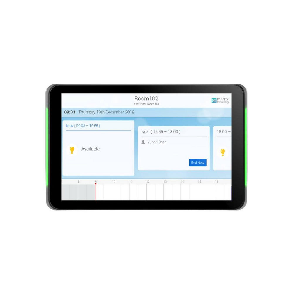 This versatile IAdea XDS-1078-A9 Advanced 10.1-Inch Interactive Room Panel Display features built-in programmable LED side lights that indicate room status with green for available and red for occupied - making it easy to check room availability from a distance.