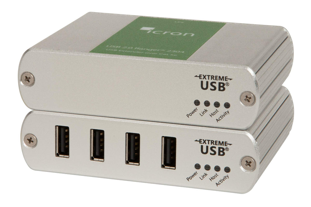 The Icron 2304 is a four-port Icron Ranger 2304 provides true USB 2.0 extension at up to 480Mbps over Cat 5e cabling, without the need for supplementary software drivers. With thanks to Extreme USB, this true plug-and-play solution is compatible with all leading operating systems and supports all USB 3.0, 2.0 and 1.1 peripherals including Keyboards, webcams, mice, flash drives and interactive whiteboards across a dedicated Cat 5e connection.