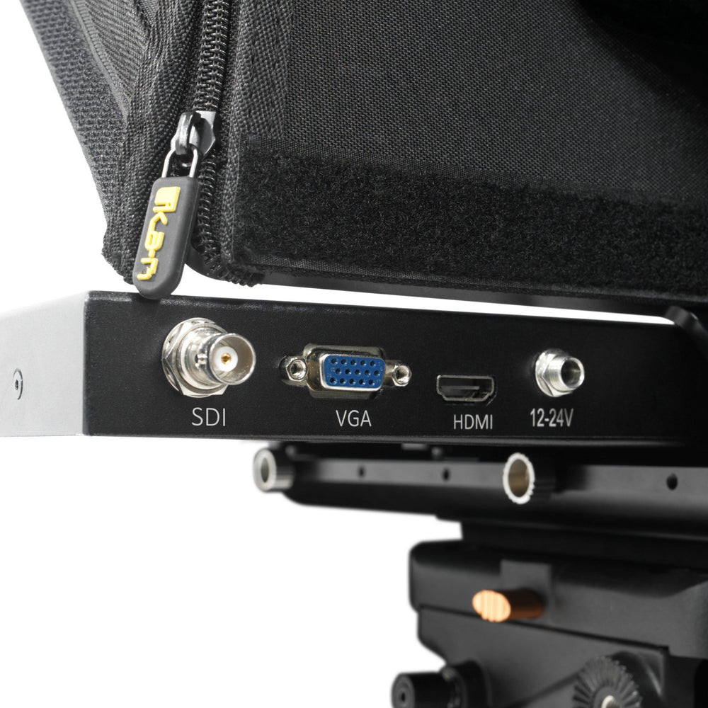 This PTZ teleprompter includes a high bright SDI capable monitor that also supports HDMI and VGA inputs for versatile video connectivity. The unit includes tally light support to integrate with switcher systems that provide on air and preview indication. Adjustable mounting points and included risers help balance the teleprompter and camera rig for reliable operation.