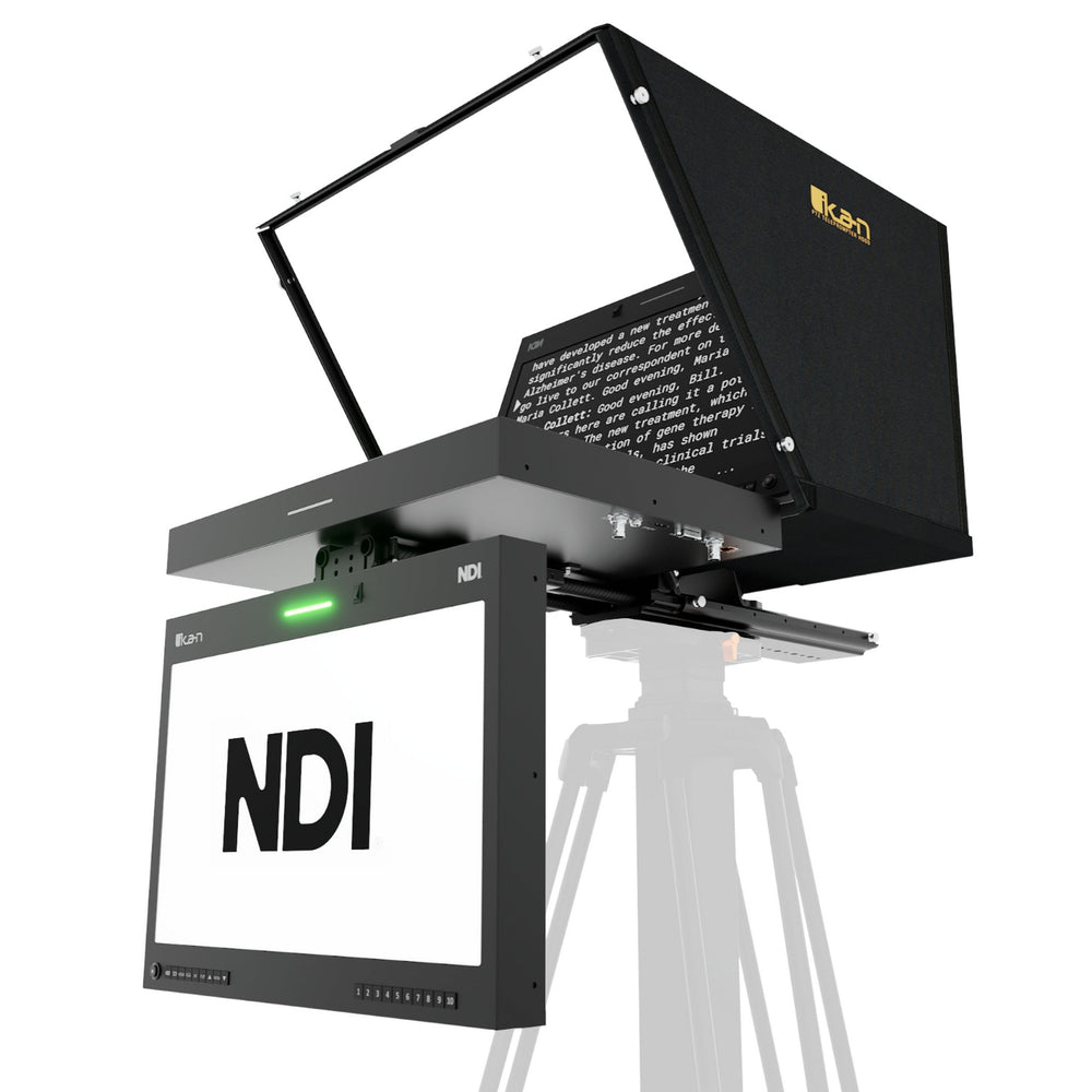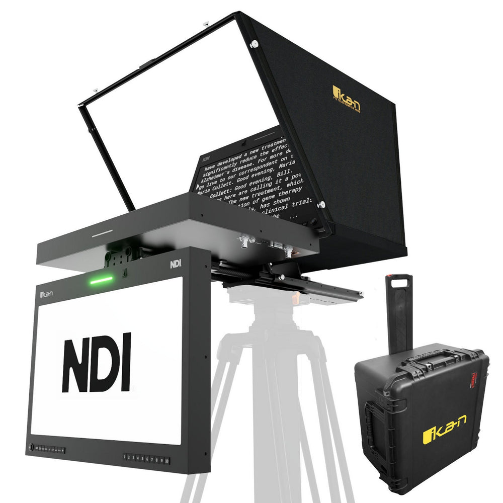 Ikan Aura 19-Inch POE++ PTZ NDI Teleprompter, NDI Talent Monitor with Full NDI Encoding/Decoding, IP Tally Light, and Travel Kit