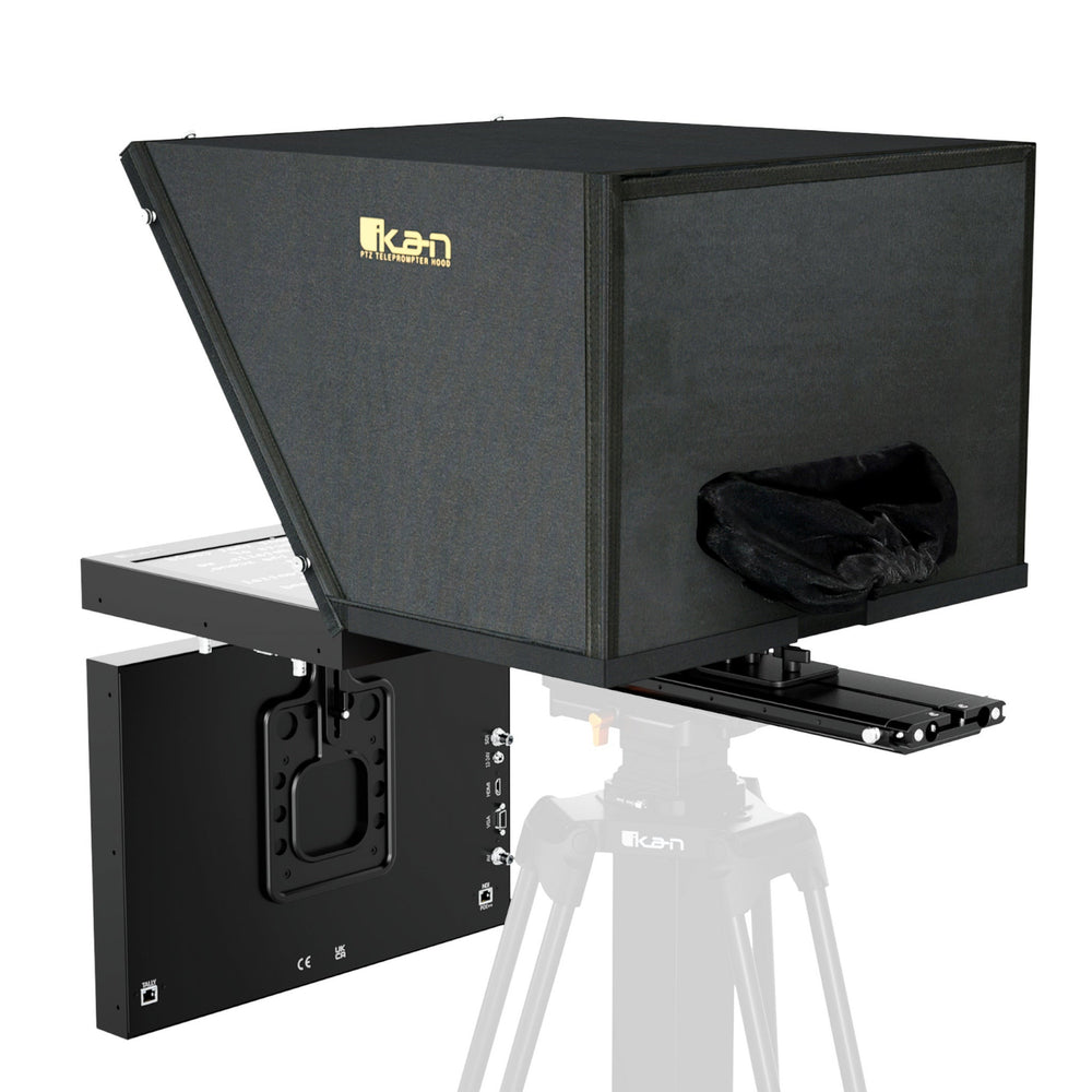 Durable construction and adjustable mounting options provide long term reliability for continuous use in studios or on location. The fully enclosed PTZ camera hood allows unrestricted pan tilt and zoom while preserving script visibility. Integrated tally and adjustable riser plates make this solution flexible across a range of professional PTZ and ENG camera setups.