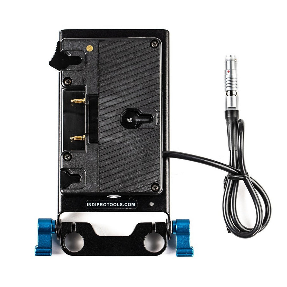 The IndiPRO Gold Mount Plate for the C300 Mark II offers punch-out screw holes and is designed to be attached to cheese plates, sold separately. It features a 24 Inch cable with a LEMO type connector compatible with the C300 Mark II, and offers a D-Tap output supporting 12-16V accessories. For mounting this unit comes standard with a 15mm rod system.