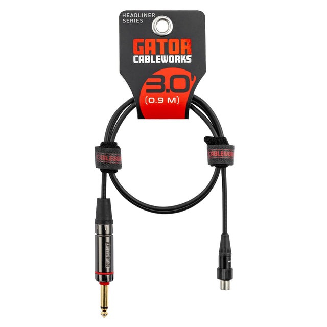 Gator Cableworks GCWH-TA4F-3QT is an instrument connection cable designed to connect guitars and other instruments to wireless bodypack transmitters. It enables quiet and reliable signal transfer from an instrument output to a locking mini XLR input for performers using wireless systems. This makes it ideal for live performance situations where noise free connections and secure cabling are critical.