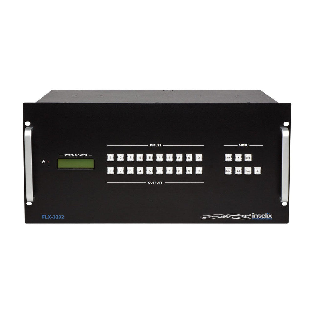 The Intelix FLX-3232 is a modular video matrix switcher that supports up to 32 inputs and 32 outputs. There are eight input slots and eight output slots; each modular input or output card supports up to four device connections. In addition to front panel control, the FLX-3232 can be controlled via IR, RS232, or TCP/IP connections.