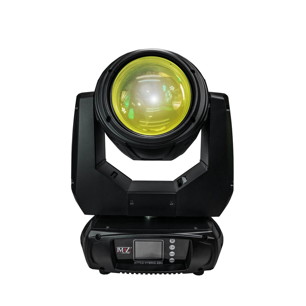 The JMAZ ATTCO HYBRID 230 Features with Super Prisms (16 facet+24 facet prism)and a powerful, ultra bright OSRAM 7R lamp, 3 phase motors , Solid Beam angle: 2.5 ,Anti-reflection 136mm front lenses. JMAZ ATTCO HYBRID 230 is integrated with a full complement of professional characteristics including a static gobo wheel (16 gobos) ,a color wheel (11 colors), Frost filter, Motorized focus from near to far (2.5M-30M), variable speed shutter/strobe, 0-100% linear dimmer