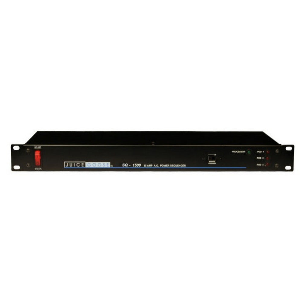 The SQ-1500 has a 15 amp capacity with 7 AC power outputs on the rear of the chassis. One output is unswitched. The remaining 6 outputs are grouped into 3 Power Pods of two outputs each. Each Power Pod is an individual sequence event. All outputs have Juice Goose quality surge and spike protection as well as line noise filtration.