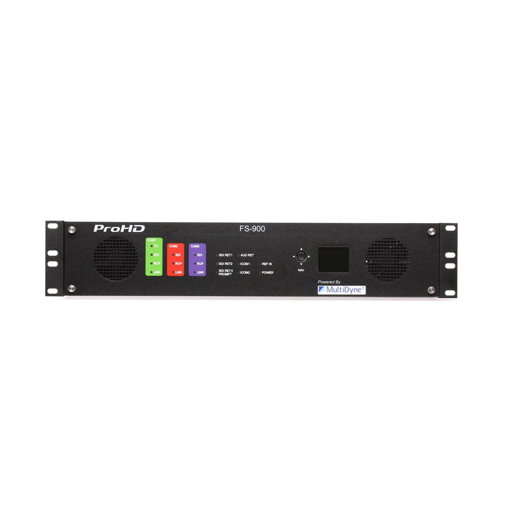 The FS-900 is a new camera mounted Fiber optic system designed for JVC's GY-HM890 and GY-HC900 camcorders. Built exclusively for JVC by MultiDyne Video & Fiber-Optic Systems, the system supports 3G-SDI 1080p/60 camera feeds and returns, and takes advantage of the camera's built-in streaming engine for video-over-IP functionality. The camera module connects directly to the back of GY-HM890 or GY-HC900 camcorder via 68-pin interface-no external cables required-for full studio functionality. It transports multiple bi-directional 3G-SDI signals as well as control, audio, sync, and intercom between the camera and the FS-900 Base Station. Up to three cameras are supported by the Base Station, and its redundant power supplies provide up to 150 watts for each camera, as well as prompters and talent monitors. Its three-in-one configuration provides a more cost efficient solution than other multi-camera solutions previously offered by JVC and other manufacturers.